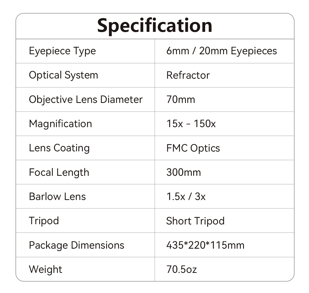 • Refractor Optical System - Provides clear, true-to-life images with accurate color reproduction, ideal for stargazing and sightseeing.